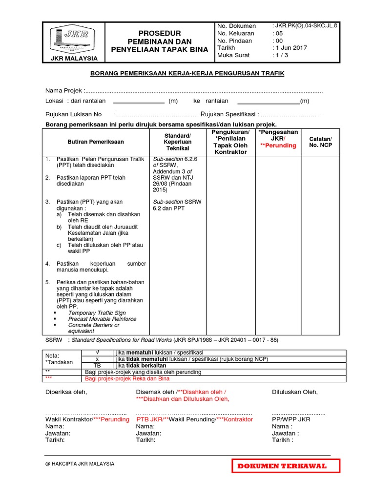 Prosedur Pembinaan Dan Penyeliaan Tapak Bina Jkr Malaysia Borang Pemeriksaan Kerja Kerja Pengurusan Trafik