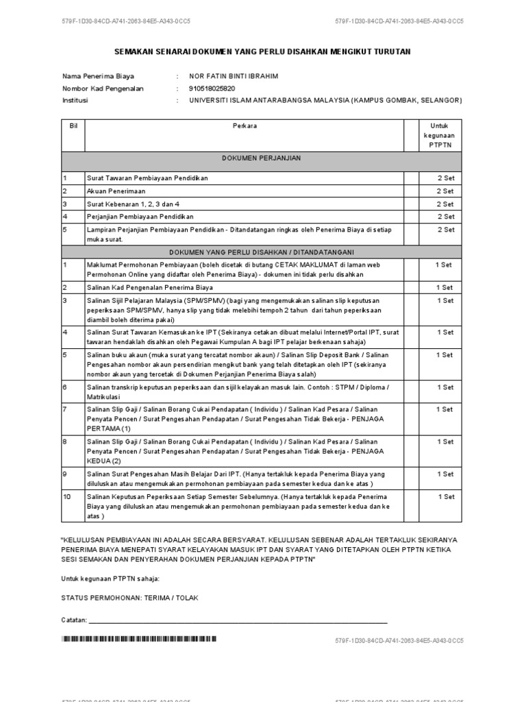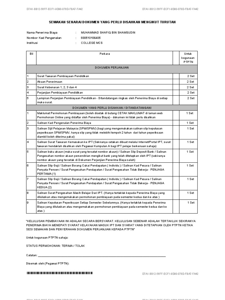 1 salinan adalah menjadi tanggungjawab pelajar untuk mempastikan bahawa kursus pengajian yang diikuti telah diluluskan pihak berkaitan dan syarat kelayakan masuk kursus telah dipatuhi. Dokumen perjanjian ptptn 2 set 3. Perbadanan tabung pendidikan tinggi nasional tingkat bawah menara ptptn blok d. Masukkan nama kursus atau nama ipt anda untuk membuat carian.