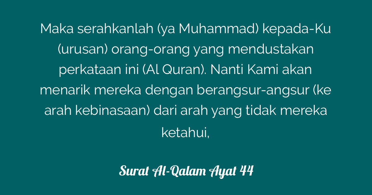 Kelak akan kami hukum mereka berangsur angsur dari arah yang tidak mereka ketahui 45. Terjemah surat al qalam ayat 44 47. ف ذ ر ن ي و م ن ي ك ذ ب ب ه ذ ا ال ح د يث س ن س ت د ر ج ه م م ن ح ي ث ل ا ي ع ل م ون.