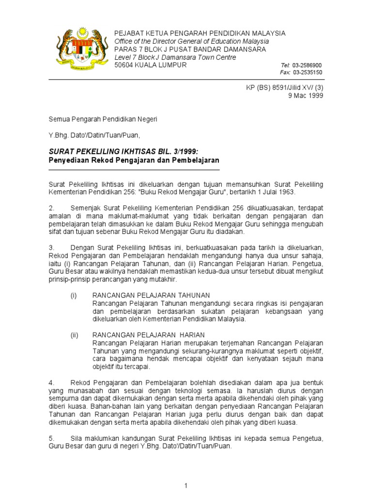 Surat Pekeliling Ikhtisas Bil 3 1999 Penyediaan Rekod Pengajaran Dan Pembelajaran