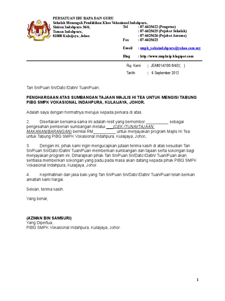 Surat Penghargaan Dan Terima Kasih Atas Sumbangan