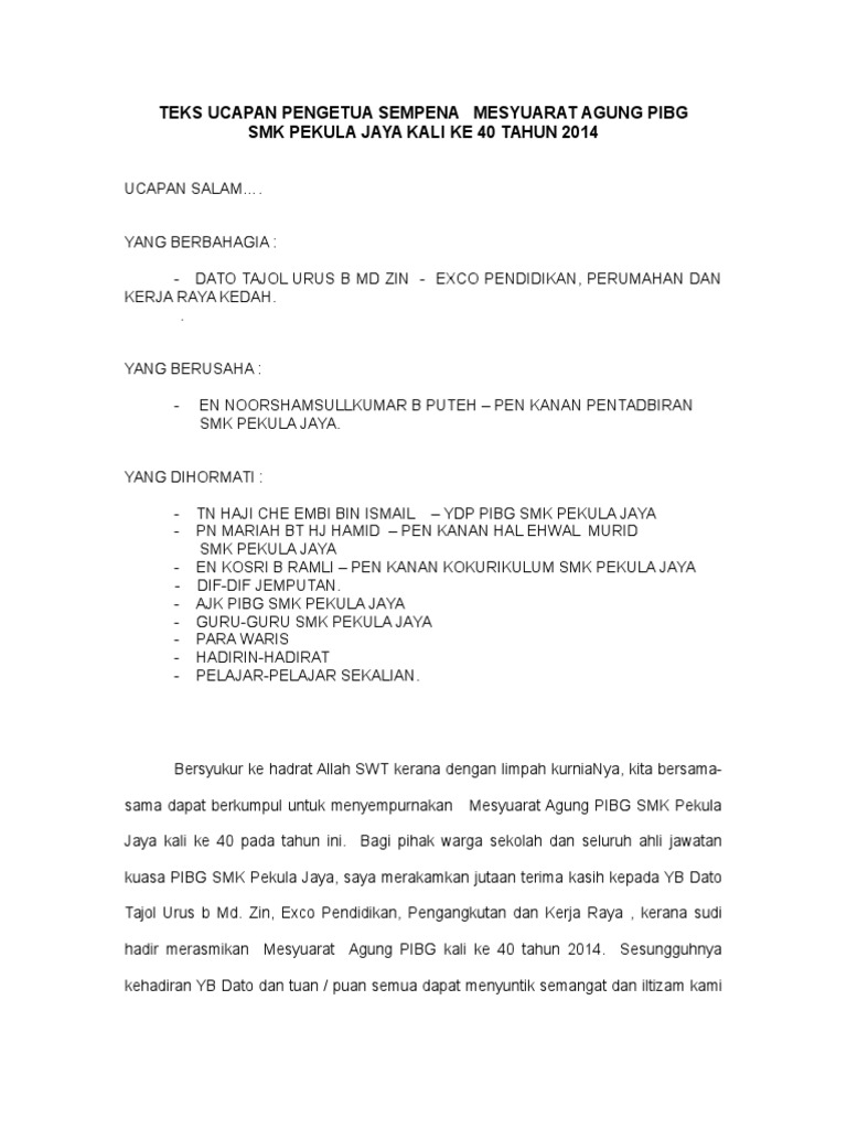Teks Ucapan Ydp Pibg Sempena Mesyuarat Agung Pibg Smk Pernu Kali Ke