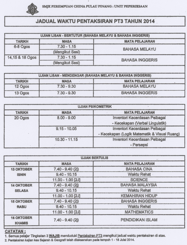 Jadual Pentaksiran Ujian Lisan Bahasa Melayu Dan Bahasa Inggeris Smk Taman Tun Aminah Johor Bahru