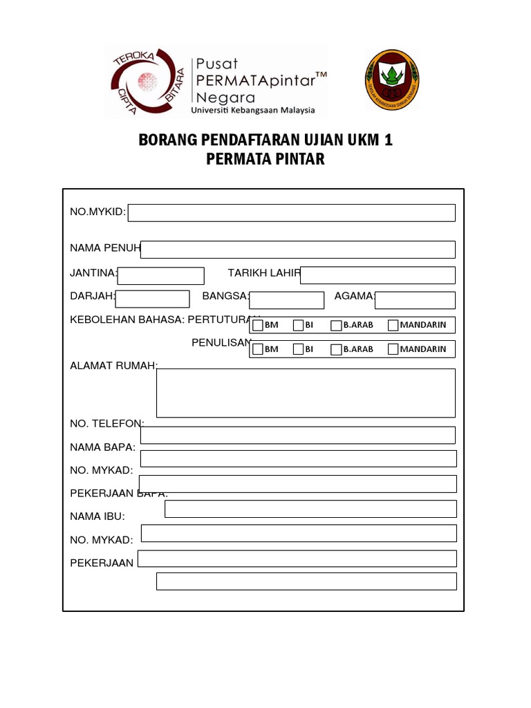 Borang Pendaftaran Ujian Ukm 1 Permata Pintar No Mykid