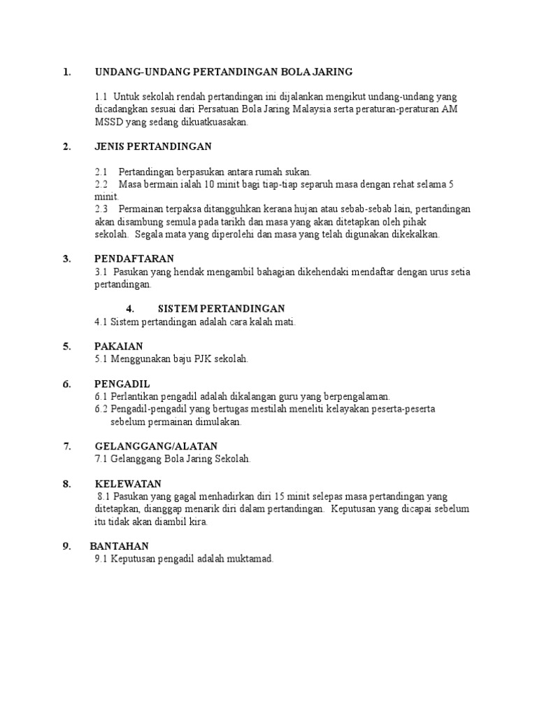 Undang Undang Peraturan Dan Format Pertandingan Bola Pertandingan Bola Jaring 6 1 2 Setiap Pasukan Hanya Dibenarkan Mendaftar 10 Pemain 6 3 6 Semua Perlawanan Akan