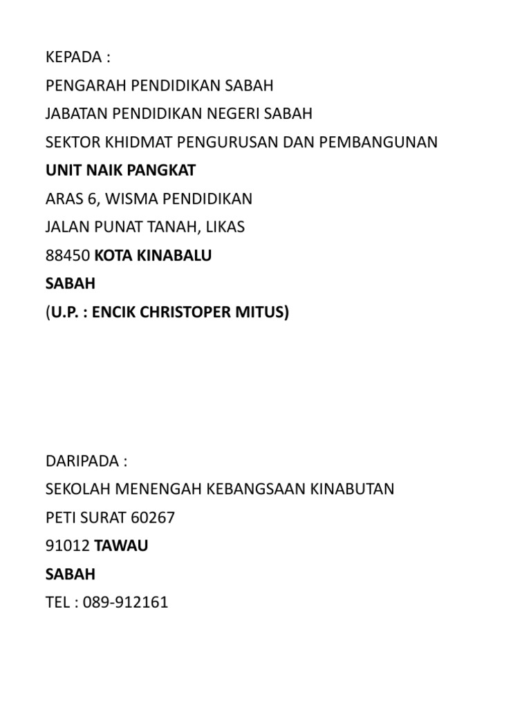 Sektor Khidmat Pengurusan Dan Pembangunan Unit Naik Pangkat Tingkat 5 Rumah Persekutuan Jalan Mat Salleh 88604 Kota Kinabalu